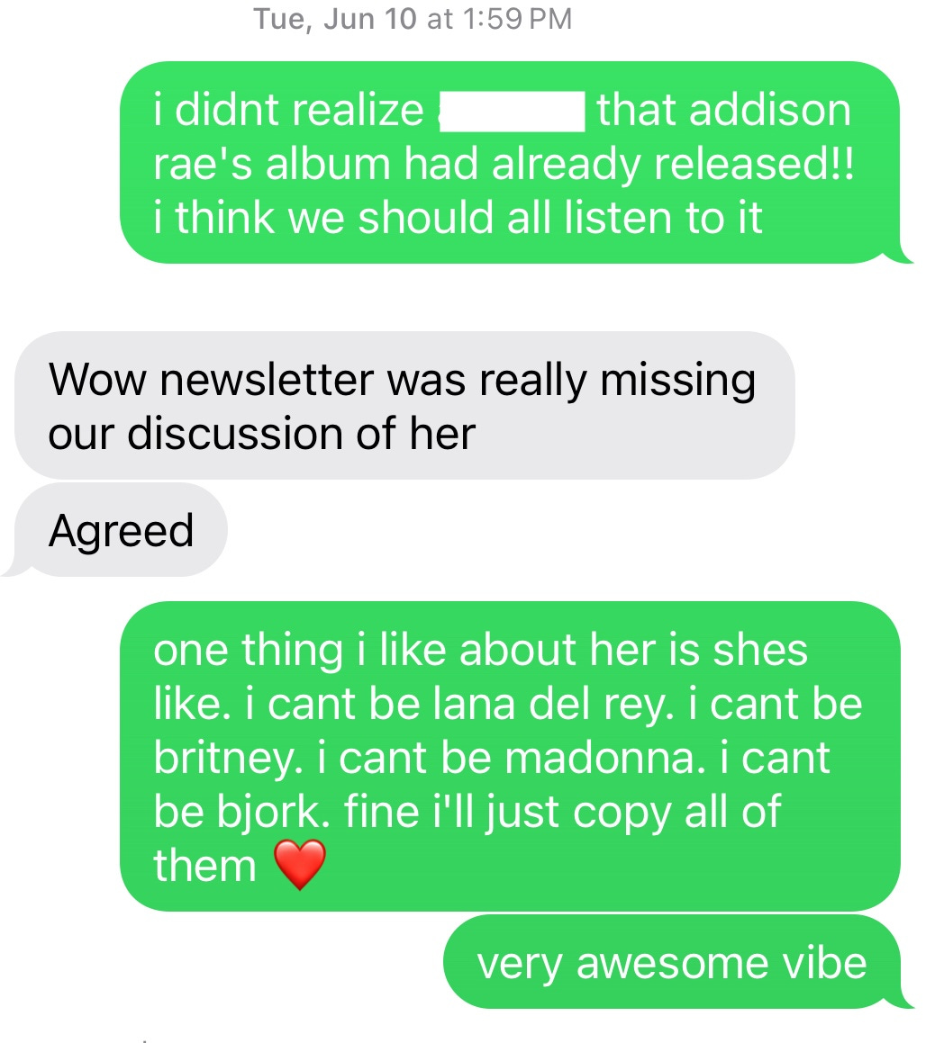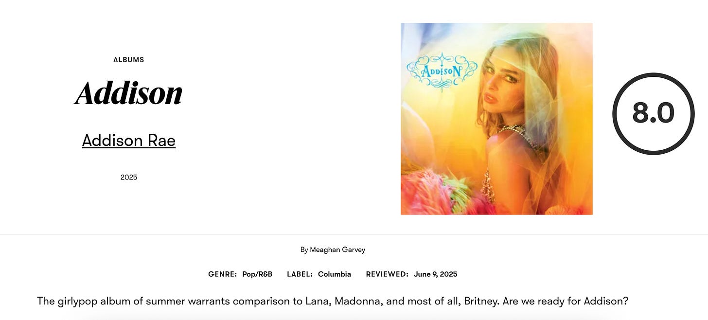 I’ll write again when the books are ready with an image of one as proof that they actually exist. In the meantime, here’s my review of what I think I must call my favorite album of the year: Addison Rae’s Addison.